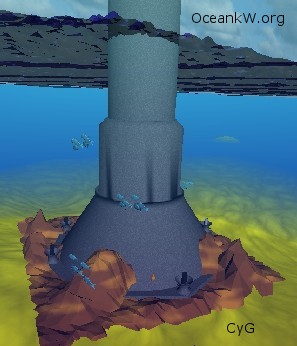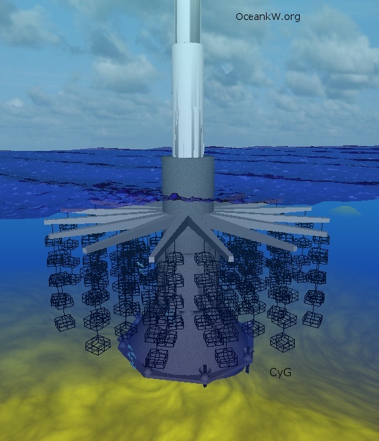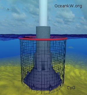 La base est en béton moulé. La faire cylindrique ou ressemblant à récif artificiel change à peine les coûts de fabrication. Les formes pourraient être élaborées judicieusement de façon à se faire coloniser par telle ou telle espèce de poisson. Ce récif pourrait devenir un lieu de plongée, ou de pêche sous marine. L'exploitation du site se ferait par du personnel formé, et surveillant localement le stock de poissons.