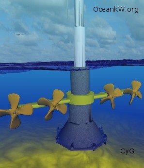 Des hélices orientables, entraînées par les courants permettraient de produire 1MW d'électricité en plus de ce qui est produit par l'éolienne.